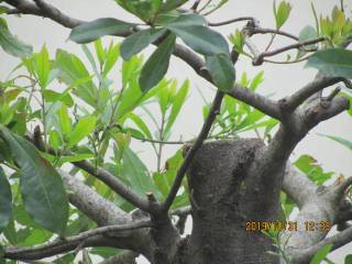 ヤマモモ(雌雄2本):原状高より各々を1mほど切断し、高さ約2mとして、張り過ぎた枝の矯正のため、枝先の葉を残し、枝元での発芽を促進させるべく、剪定をしたが、1か月後、期待どおり枝元で旺盛な発芽が観察された。