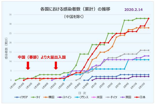▼ 各国における感染状況 2020年2月14日現在