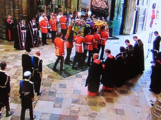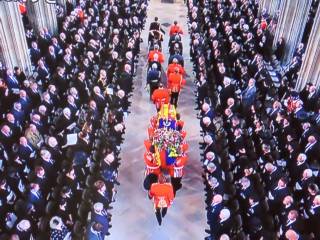ウェストミンスター寺院での国葬は、19日の11.00に始まった。王室遺族に加えて、英国政界幹部や首相経験者、世界各国の元首や政府首脳が出席。エリザベス女王が支援した種々の慈善団体の代表も参列した。