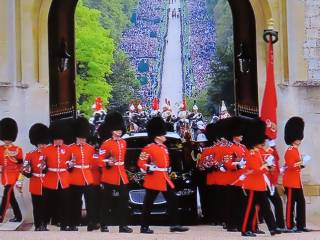 ウェリントン・アーチで王室の霊柩車に移されたエリザベス女王の棺は、2時間もの長き葬列行進を経て、15.40ごろ、ウィンザー城内の複合施設に到着。城内の中庭で、先着のチャールズ国王と王室の主要メンバーに迎えられた。女王の棺はその後、16.00からの埋葬式のため、聖ジョージ聖堂へ移された。