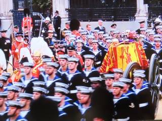 英国海軍の142人の兵士が引くロイヤル・キャノン・トレイン(大砲車)に載せられた女王の棺は、12.38ごろ、ロンドンのホース・ガーズにある英王室の主要儀式を行う施設:ホース・ガーズ・パレードを通過した。ホース・ガーズ・パレードは、官庁街ホワイトホールの隣に位置し、パラディオ様式の近衛騎兵隊博物館、兵舎、厩舎である建物やロイヤル騎兵衛隊のパレード場となる広場から成り、毎日午前中に騎兵隊交代式が行われる。イギリス軍の本部の所在地でもある。