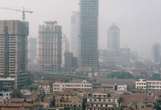 中国・武漢の景観 黄色い空気に包まれるホテル窓外