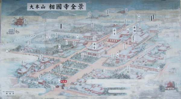 相国寺の名の由来は、義満が左大臣であり、中国で左大臣は「相国」ということから、また「相国」とは国をたすける、治めるという意味であることから夢窓疎石の弟子・春屋妙葩が提案したとのことである。
